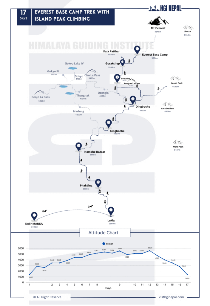 Island Peak summit at 6,189 m is the highest point, while Everest Base Camp reaches 5,364 m.
