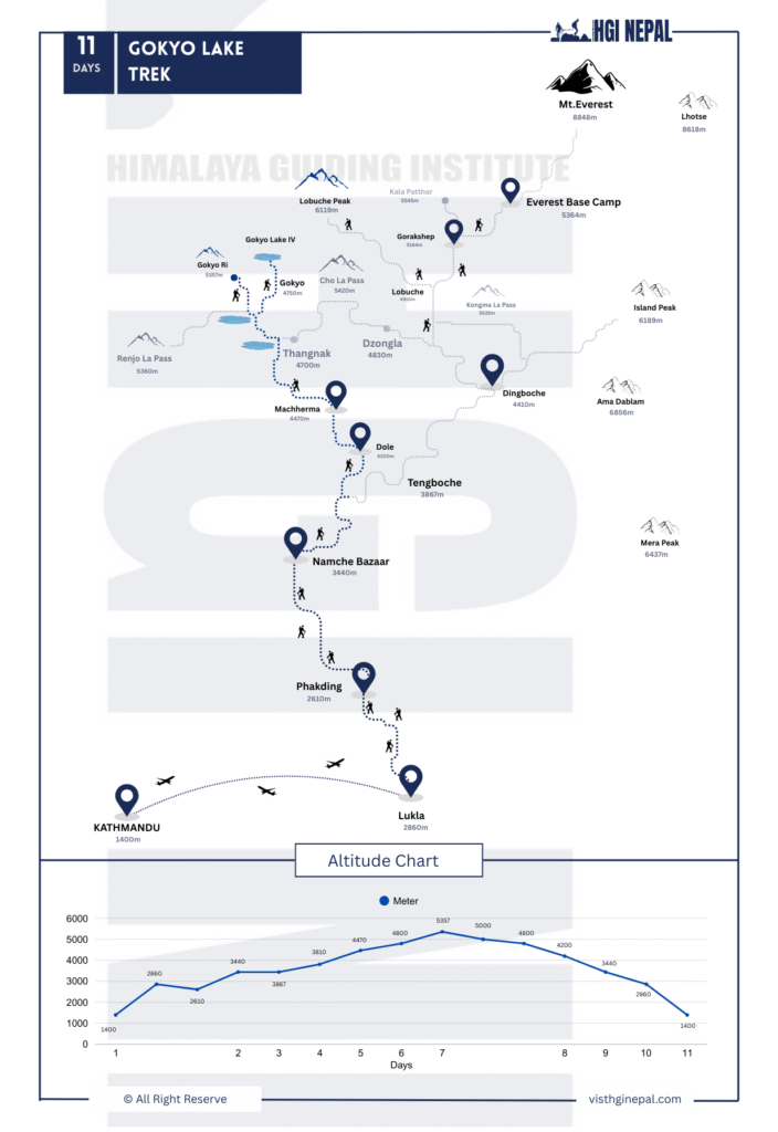 A scenic trek in the Everest region, visiting the pristine Gokyo Lakes and offering views of the Himalayas including Everest, Lhotse, Makalu, and Cho Oyu.